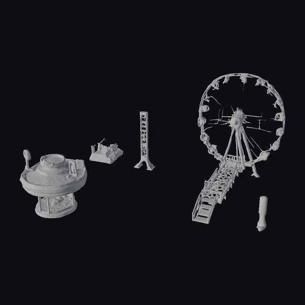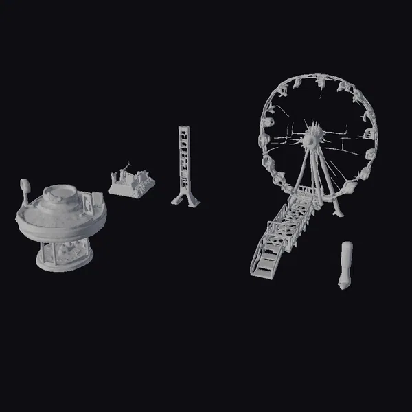 Perched menacingly against a darkened sky, the skeletal Ferris wheel stands as a haunting reminder of forgotten joy. The model showcases a meticulously crafted abandoned amusement park, complete with a dilapidated ticket booth, a twisted metal framework, and a variety of textures that convey the decay and neglect. The rusty hues and peeling paint add depth to the scene, inviting users to explore the narrative behind the abandonment. Ideal for projects requiring a dark, immersive environment, such as games, animations, or architectural visualizations, this model set offers a wealth of creative possibilities.