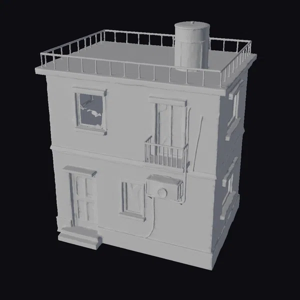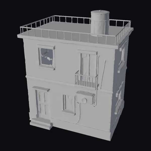 Perched on a foundation of weathered concrete, this two-story brick building rises with a sense of resilience, its reddish-brown hue now muted by the patina of age. The metal railing on the flat roof, the air conditioning unit on the side, and the barred windows all tell a story of functionality now lost. The peeling paint and exposed brick reveal a complex history, layers of which are visible in the detailed textures and lighting effects. A broken window on the second floor adds a touch of melancholy, while the green light above the door hints at life or hope. This model is perfect for projects requiring a gritty, urban backdrop, suitable for games, architectural visualizations, or film and animation projects seeking to capture the essence of urban decay.