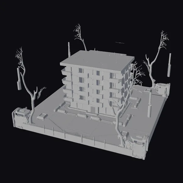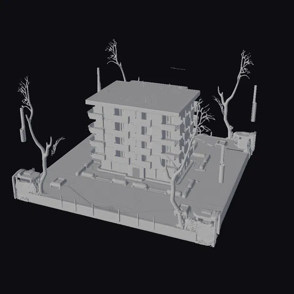 In the heart of a seemingly abandoned city, a multi-story building with a flat tan roof stands prominently. Its facade is a mosaic of red, blue, and white, with each floor boasting balconies that are bathed in the warm glow of interior lighting. The building’s design suggests a functional urban architecture, now eerily deserted. The scene is framed by leafless trees, their branches stretching towards the sky like skeletal fingers. A couple of cars, one yellow and one blue, are parked along the street, adding a touch of recent habitation to the otherwise deserted scene. The urban landscape, complete with streetlights and a fenced perimeter, invites the viewer to ponder the story behind its abandonment. This 3D model is perfect for projects requiring a blend of urban realism and a touch of mystery, suitable for use in games, architectural visualizations, VR/AR experiences, animations, and designs that seek to evoke a sense of urban decay or post-apocalyptic scenarios.