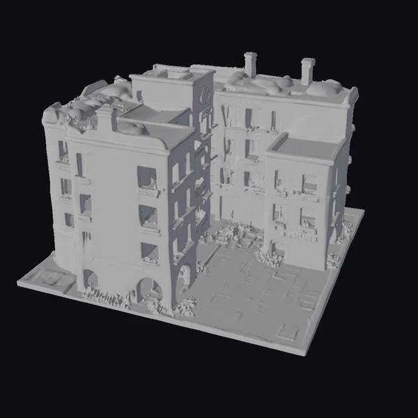Perched on a weathered base, this meticulously crafted 3D model presents a compact, abandoned cityscape. The scene features a mix of multi-story brick buildings with peeling facades, their windows like empty eyes staring back. Tight alleys weave between structures, adding depth to the urban landscape. Graffiti dances across walls in a riot of color, juxtaposed against the somber tones of crumbling concrete and rusting metal. The buildings’ varied heights and angles create a dynamic, immersive environment. This model is perfect for projects requiring a gritty, realistic urban setting, such as games, architectural visualizations, or animations seeking to capture the essence of urban decay.