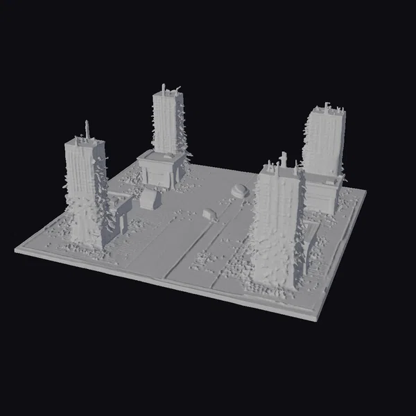 In a scene that echoes the desolation of a world left behind, four towering skyscrapers stand sentinel over a deserted street, their gray facades weathered and worn. The urban landscape, once bustling with life, now lies barren and still, with only a few vehicles remaining as silent witnesses to the passage of time. Overgrown vegetation creeps up the sides of the buildings, a poignant reminder of nature’s relentless march. The scene is set on a rectangular base, with a road cutting through the center, flanked by the imposing structures. This 3D model is perfect for projects that require a post-apocalyptic or dystopian setting, such as games, animations, or architectural visualizations. Its detailed textures, from the crumbling concrete to the rusting cars, invite the viewer into a world both haunting and mesmerizing.