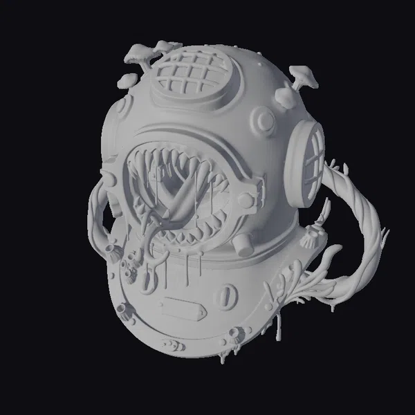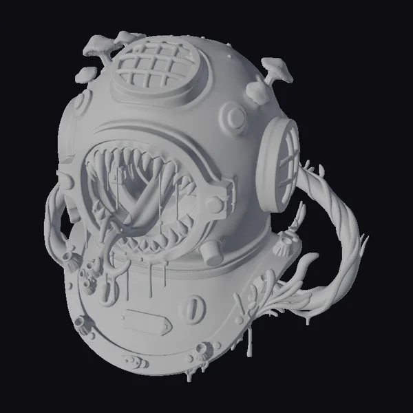 This haunting diving helmet appears to have been claimed by the depths of the ocean, with a corroded metal exterior covered in slimy green growths and vibrant red mushrooms. The helmet’s faceplate is open, revealing a cavernous mouth filled with rows of razor-sharp teeth, while a tangle of purple and blue tendrils sprouts from the side. The overall effect is one of decay and malevolence, as if the helmet has been transformed into a twisted, nightmarish creature. The intricate details and textures make this model perfect for use in games, 3D printing, VR/AR experiences, animation, and design projects where a touch of horror and fantasy is needed.