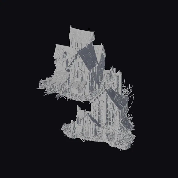 Perched precariously, these abandoned hamlet houses appear to defy gravity, their roofs a patchwork of worn wooden planks and slate tiles. The walls, a warm beige hue, are cracked and crumbling, with vines and moss sprouting from every crevice. The windows, once bright and cheerful, now stare like empty eyes, their glass long since shattered. The twisted roots of ancient trees have grown through the foundations, as if trying to pull the structures back into the earth. The atmosphere is heavy with the scent of damp earth and decay. Ideal for use in games, animations, or architectural designs seeking a touch of mystique and abandonment.