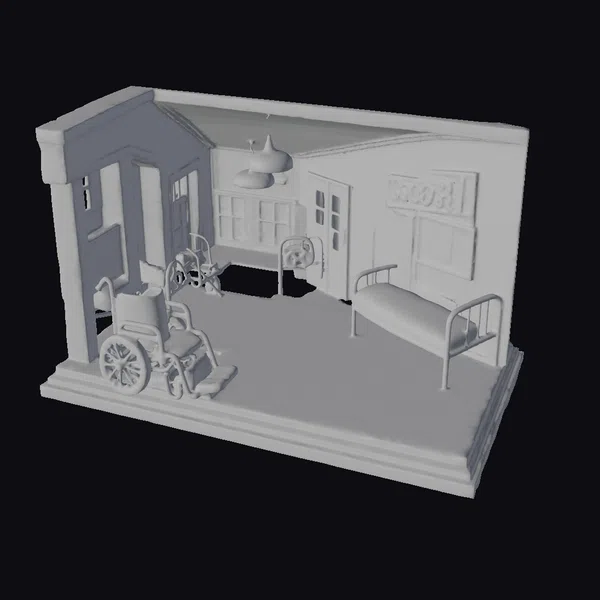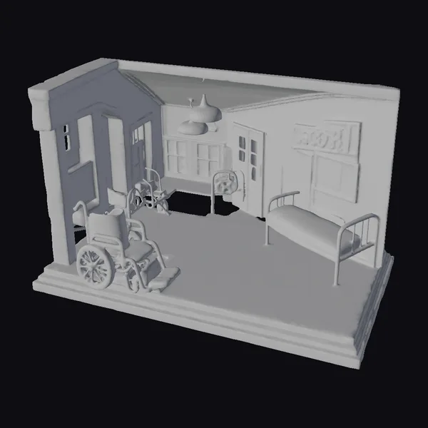 In the heart of desolation, a hospital ward lies abandoned, its interior a poignant testament to times past. The room is bathed in a dim, eerie light that filters through grimy windows, casting long shadows across the worn linoleum floor. A single hospital bed, its metal frame rusted, stands against one wall, a metal wheelchair beside it, both seeming to wait for patients who will never return. Two additional wheelchairs are positioned near the entrance, as if their occupants had just stepped out for a moment. The walls, once a beacon of cleanliness, now wear a dismal coat of peeling paint and age. Fluorescent lights hang from the ceiling, their dull glow adding to the sense of neglect. This 3D model of an abandoned hospital ward captures the haunting beauty of decay, perfect for projects that require a setting of melancholy and abandonment. Ideal for use in films, video games, and virtual reality experiences, it brings an authentic touch to any narrative of loss and nostalgia.