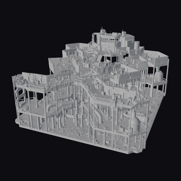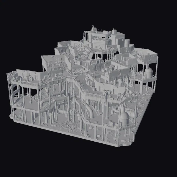 Perched on a raised platform, the abandoned industrial command center sprawls across the landscape, its complex network of walkways, staircases, and catwalks a testament to its former functionality. The structure’s core is a labyrinth of metallic corridors and chambers, punctuated by cylindrical machinery and control rooms. Flickering fluorescent lights and eerie shadows dance across the walls, casting an otherworldly glow. As you explore the nooks and crannies, you can almost hear the whispers of a long-forgotten workforce. This 3D model is perfect for projects requiring a gritty, industrial aesthetic, such as games, animations, or architectural visualizations. Its high level of detail and realistic texture make it an excellent choice for adding a touch of realism to your project.