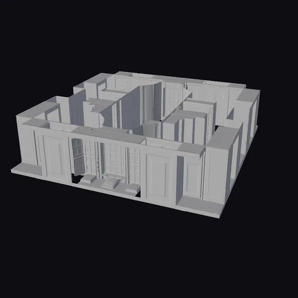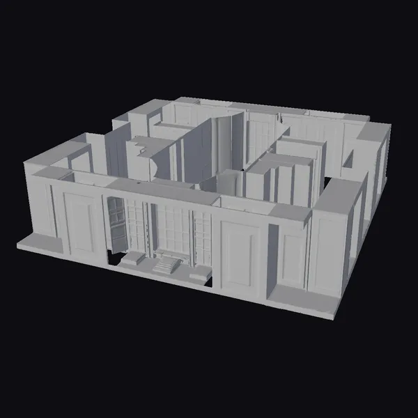 In a state of disrepair, this industrial interior showcases a complex layout with multiple doorways, corridors, and rooms. Orange light filters through grimy windows, casting an eerie glow on the walls. Weathered textures, rusty hues, and a general air of decay evoke a sense of neglect and abandonment. The intricate details make this 3D model perfect for projects requiring an industrial or post-apocalyptic setting, such as games, animations, or architectural designs.