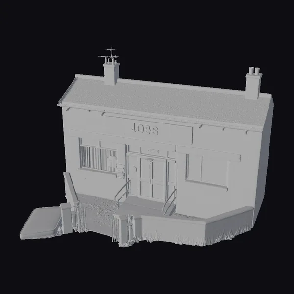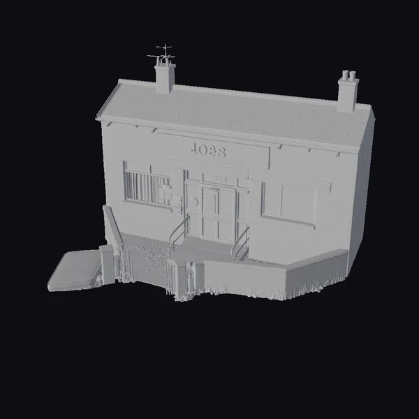 Gaze upon the intricate details of this abandoned job center, captured in a highly detailed 3D model. The building’s brick exterior shows signs of aging, with a faded green sign reading ‘JOBS’ hanging above the entrance. The double doors, once a gateway to opportunities, now stand shut, while the windows, some boarded up, let in little light. The roof, complete with chimneys and an antenna, adds to the authenticity of this scene. This model is perfect for projects aiming to depict urban decay, economic downturn, or simply a nostalgic look back. It can be used in various applications such as games, architectural visualizations, film and animation projects, or even virtual reality experiences.