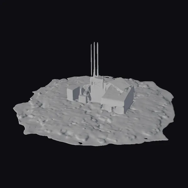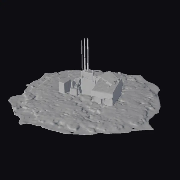 In a stark, unforgiving environment, the abandoned lunar base sprawls across a rugged, rocky terrain, its gray, industrial facade a poignant reminder of humanity’s fleeting presence in space. The base’s architecture is characterized by a central structure with a series of antennae piercing the sky, suggesting a once-thriving hub of activity now reduced to silence. The surface beneath the base is uneven and cracked, with a large, dark stain that could be a sign of damage or a natural occurrence. The textures are rough and detailed, capturing the harsh conditions of the lunar surface. This model would be perfect for projects aiming to depict desolate, sci-fi landscapes, such as animations, games, or virtual reality experiences focused on space exploration and its challenges.