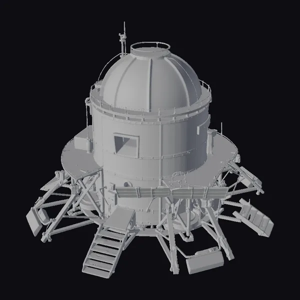 The abandoned lunar research station stands as a haunting monument to the transience of human endeavor in space. Its metal stilts rise like skeletal fingers from the ground, supporting a structure that seems to defy gravity with its rounded, domed silhouette. The once-pristine surface has given way to the relentless assault of lunar weather, with streaks of green moss and rust painting a picture of decay. A small staircase leads to a door that hangs slightly ajar, as if inviting – or warning – passersby of the secrets within. The station’s design speaks to a bygone era of scientific exploration, its details meticulously crafted to evoke a sense of realism and immersion. This 3D model is perfect for projects seeking to capture the eerie beauty of abandoned technology, suitable for use in games, 3D printing, VR/AR experiences, animations, and architectural designs that require a touch of sci-fi mystique.