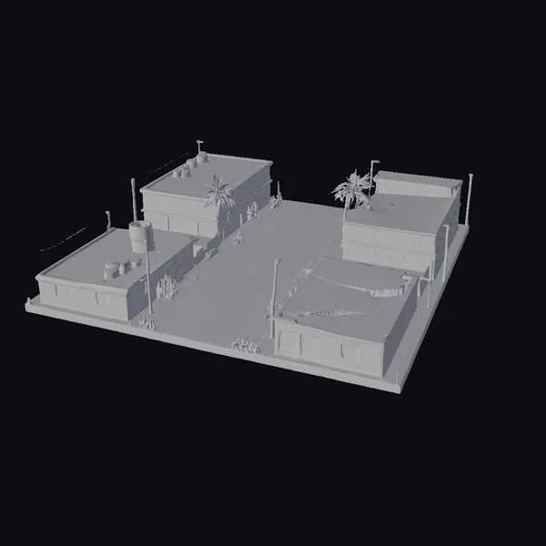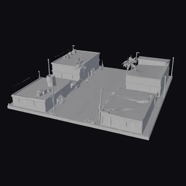 Perched on a nondescript sidewalk, three worn buildings stand sentinel, their brown rooftops a testament to years of neglect. The central building, with its faded green accents, appears to be a hub of activity, albeit a long-forgotten one. Palm trees, once tended, now lean towards the empty street, their leaves rustling softly in the morning breeze. The scene is bathed in a warm, golden light, highlighting the textures of peeling paint and rusty metal. This 3D model is perfect for projects requiring a realistic, abandoned cityscape, ideal for use in games, animations, architectural visualizations, or VR/AR experiences.