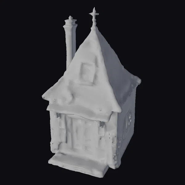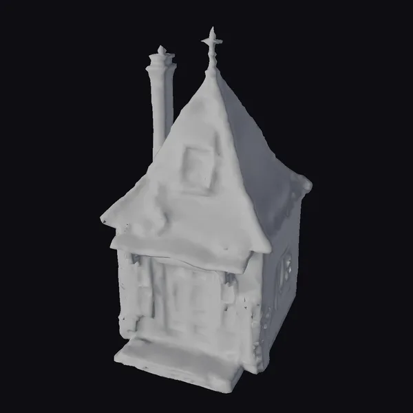 Perched on a slight elevation, this small, abandoned house exudes a mystique of desolation. The peaked roof, once perhaps a vibrant hue, now blends into the gray sky, its wooden slats worn smooth by time and weather. Moss and greenery have begun to claim the structure, creeping up the walls and covering the roof’s edges, giving it a surreal, as-if-suspended-in-time appearance. A small cross at the roof’s apex adds a touch of solemnity. The house features a single door, adorned with a simple wooden panel, and a window on the side, both hints at a life long left behind. The textures are rich, with clear indications of wear and tear, making it perfect for projects requiring a touch of dark fantasy or a hint of abandonment. Ideal for use in games, 3D printing, VR/AR experiences, animations, or architectural designs seeking a unique, story-rich element.