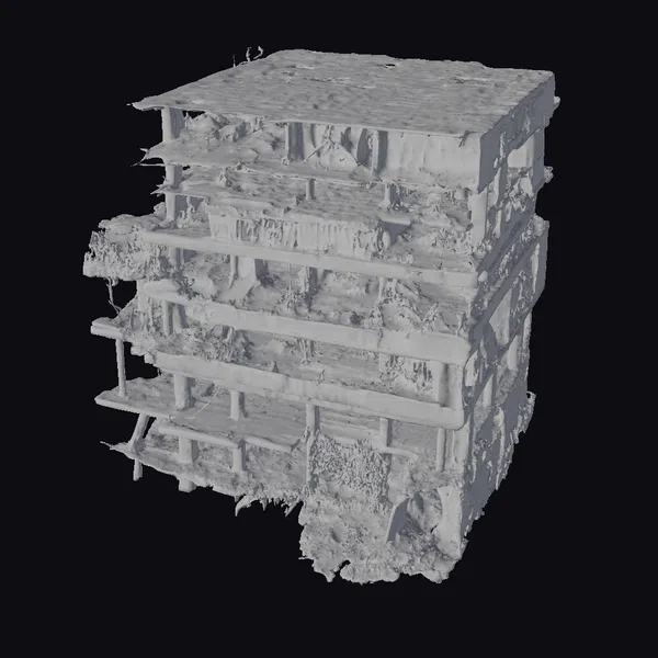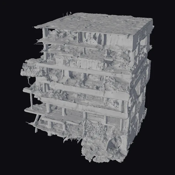 Perched at a dynamic angle, the abandoned parking garage stands as a haunting monument to neglect and urban decay. The structure’s multi-level parking deck, once a hub of activity, now lies in ruin. The concrete and steel exterior, weathered to a dull gray, shows signs of severe deterioration, with chunks missing and exposed rebar jutting out like skeletal fingers. The surface texture, rough and pockmarked, tells a story of years of exposure to the elements. As light dances across the model’s surface, it highlights the stark contrast between the garage’s former purpose and its current state of disrepair. This 3D model of a parking garage ruin is perfect for projects requiring a gritty, realistic backdrop, such as games, architectural visualizations, or film and animation projects that delve into themes of urban decay or post-apocalyptic landscapes.