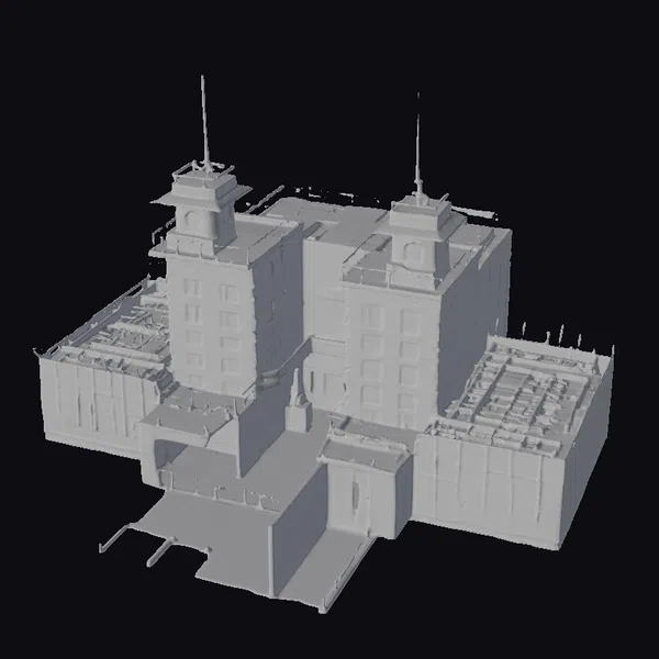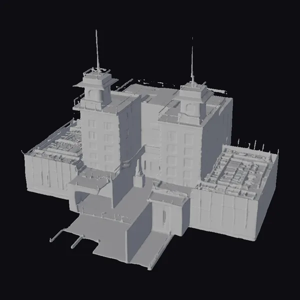 Perched in a state of disrepair, this abandoned prison structure showcases a complex design with multiple interconnected buildings. The primary structure features a gray concrete exterior with a series of windows on each level, while two towers rise from the rooftop, each equipped with antennas. The building’s entrance is marked by a recessed area, and the rooftop surfaces display signs of wear and tear. The model’s attention to detail makes it suitable for use in various projects, including games, 3D printing, virtual reality experiences, animations, and architectural designs. Its realistic style and abandoned aesthetic evoke a somber mood, perfect for projects requiring a gritty, industrial feel.