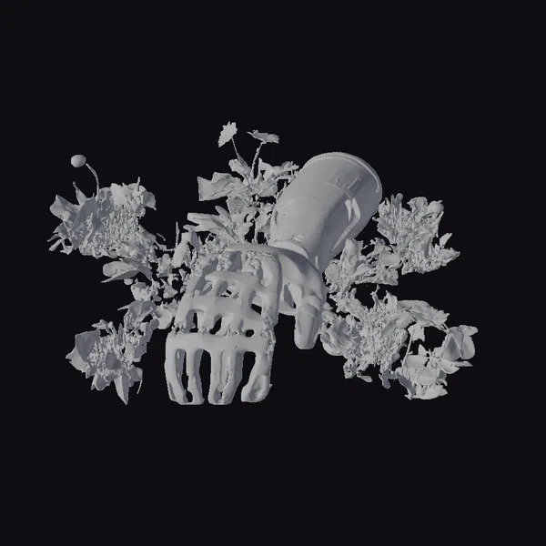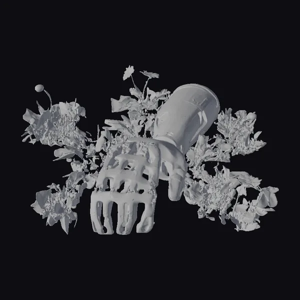 In a poignant blend of technology and nature, a prosthetic arm emerges from a bed of wild vegetation, as if reclaimed by the earth. The arm’s metallic surface, once perhaps a shiny silver, now bears the patina of neglect, with dirt and grime accentuating its mechanical details. The hand, designed with a series of finger-like projections, is splayed open, as if in a gesture of surrender or defeat. The weeds and small yellow flowers growing around and through the arm suggest a scene of long abandonment, inviting contemplation on themes of loss, memory, and the intersection of human innovation with the natural world. This model is suited for projects exploring dystopian futures, narratives of loss, or the juxtaposition of technology and nature, particularly in contexts like film, video game environments, or virtual reality experiences.