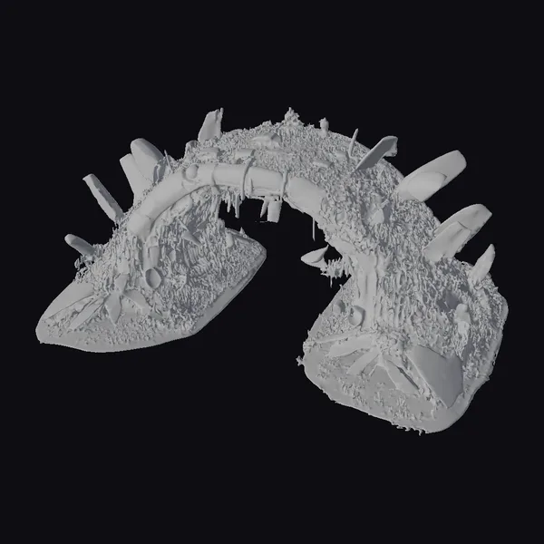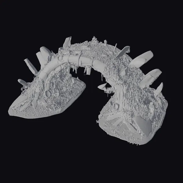 Perched on two bases, this stunning archway stretches across the scene, its pointed, cylindrical protrusions reaching towards the sky like shards of glass. The model’s surface is a testament to the relentless march of time, with rust and decay transforming the once-sleek structure into a vibrant, if dilapidated, work of art. As light dances across its surface, the arch seems to shift and change, its multicolored hues deepening and brightening in a mesmerizing display. Whether you’re a fan of sci-fi, a lover of unique architecture, or simply someone who appreciates the beauty in decay, this model is sure to captivate. Its intricate details and weathered textures make it perfect for use in 3D modeling projects, animations, or even as a striking decorative piece.