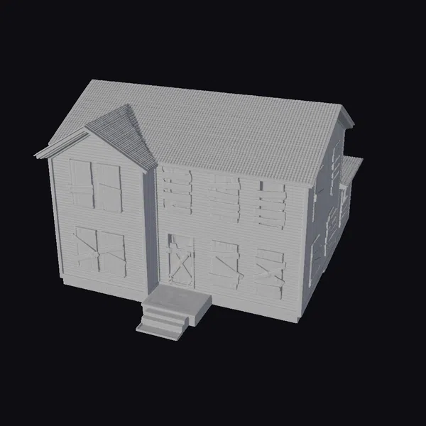 Detailed to perfection, this 3D model of an abandoned two-story house captures the essence of desolation and neglect. The gray wooden siding, paired with a dark roof, gives the house a somber appearance. Boarded-up windows and broken shutters add to the sense of abandonment, while a small set of stairs leads to a weathered entrance. The model’s intricate details make it perfect for use in games, 3D printing, VR/AR experiences, animations, and architectural designs seeking a touch of realism and storytelling.