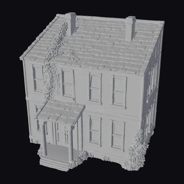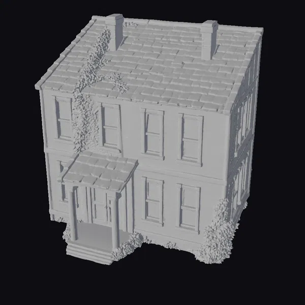 The abandoned two-story house stands with its gray stone façade weathered to a soft, muted tone, as if the very life has been drained from it. Ivy crawls up the walls, tendrils snaking through the broken windows and wrapping around the brick chimneys. The dark window frames contrast sharply with the light-colored stone, giving the house an air of melancholy. A small, covered porch protects the entrance, its roof a continuation of the main structure’s shingles. The house seems to lean slightly, as if it’s about to topple, adding to its charm and mystery. This model is perfect for projects requiring a sense of abandonment and neglect, suitable for games, animations, architectural visualizations, or virtual reality experiences.
