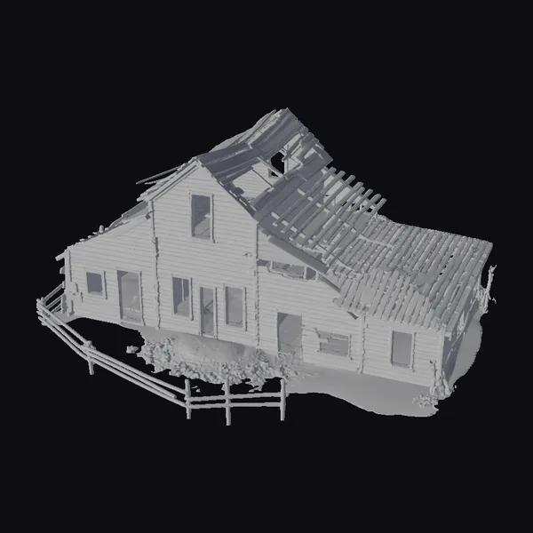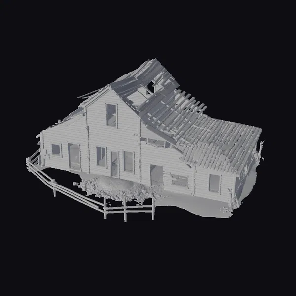 Perched precariously on the brink of collapse, this abandoned wooden farmhouse appears to be slowly being consumed by the earth. The structure’s wooden slats have faded to a mix of gray and reddish tones, giving it a worn, aged appearance. The roof, once a sturdy shield against the elements, now lies in shattered fragments, exposing the interior spaces to the mercy of wind and weather. A small, wooden fence stretches out from the front of the house, its posts weathered and worn, as if trying to hold back the inevitable descent into decay. The windows, once bright and cheerful, now stand as empty frames, a testament to the house’s long abandonment. This model is perfect for projects requiring a sense of desolation and neglect, such as animations, games, or architectural visualizations aiming to evoke a mood of decay and isolation.