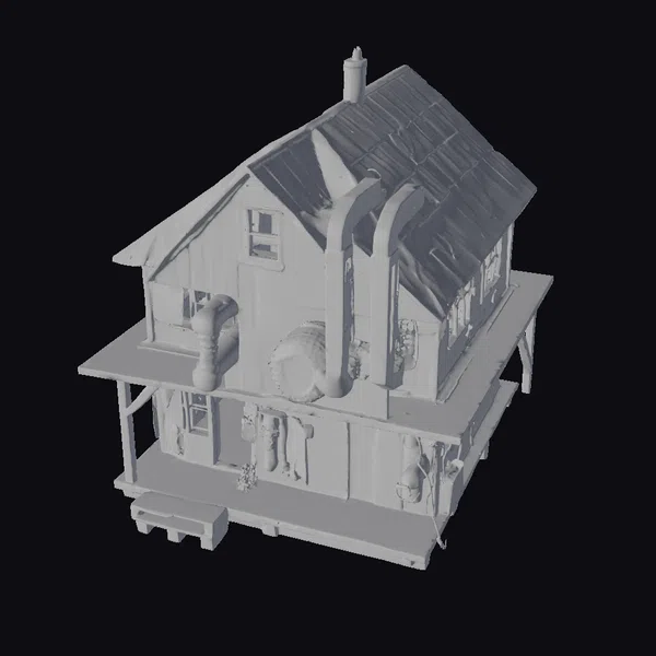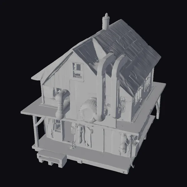 Perched on a raised foundation, this two-story wooden structure now serves as a makeshift survival base, its original quaintness overhauled with an assortment of industrial and futuristic elements. The upper level, with its wooden siding and metal roof, appears almost intact, except for the jarring presence of metallic pipes and machinery components. On the ground floor, the porch stretches across the front, supported by sturdy wooden pillars, offering a makeshift platform for defense or observation. Inside, the integration of robotic parts and survival gear hints at a story of transformation from a simple dwelling into a fortified hideout. The model is rich with details such as broken windows, a chimney, and an assortment of industrial equipment now repurposed for survival. This blend of old and new, rustic and high-tech, makes for a compelling scene in games, animations, or virtual reality experiences.