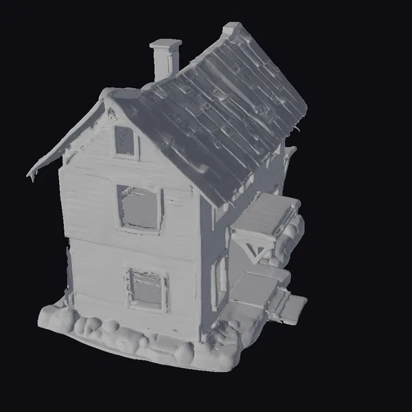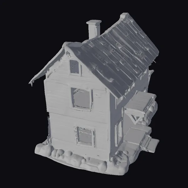 This 3D model presents a detailed, stylized representation of an abandoned wooden house that has been repurposed with futuristic robotic and survival base components. The house features a slanted, shingled roof with a visible chimney, and its wooden siding shows signs of wear and tear. Two windows are boarded up, while a small loft window remains open. A makeshift wooden platform and what appears to be a large pipe or barrel are attached to the side of the house, suggesting an improvised expansion for survival or experimental purposes. The model’s textures and lighting emphasize the contrast between the organic, weathered wood and the metallic, industrial additions. Ideal for use in games, 3D printing, VR/AR experiences, animation, and design projects that require a unique blend of old and new, this model offers a rich, detailed environment to explore.