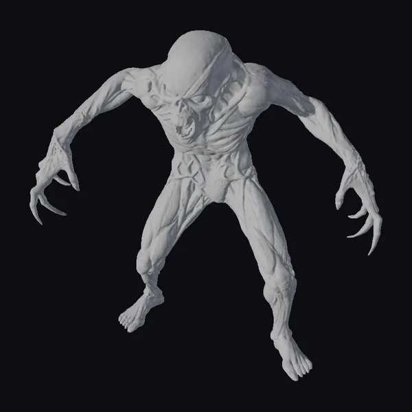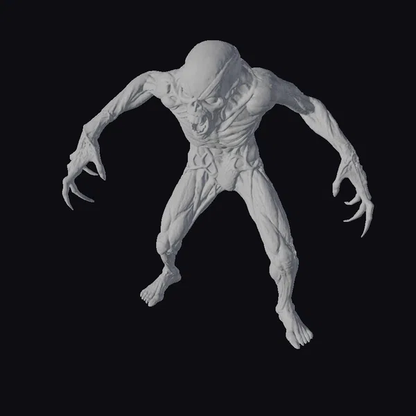 This aberrant humanoid creature stands with its legs apart, arms outstretched, and claws extended, exuding an aura of malevolence. The bulging, skeletal head features a twisted facial expression with a gaping mouth, while the pinkish-gray skin appears wet and slimy. The creature’s muscular physique and sharp claws make it a formidable, terrifying entity. Its grotesque appearance makes it perfect for dark fantasy or horror-themed projects, such as games, animations, or 3D prints.