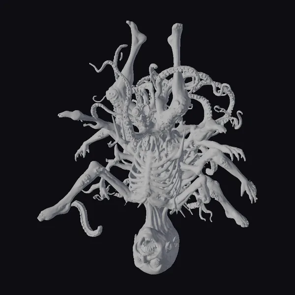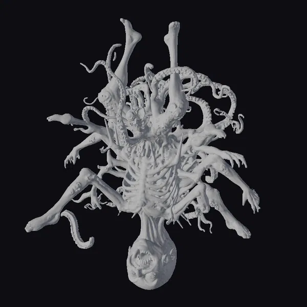 This ultra-realistic model presents a detailed, nightmarish creature with a humanoid skeleton exposed, multiple long, spindly limbs, and a mass of centipede-like tentacles sprouting from its back. The creature’s head is upside down, with a wide-open mouth full of sharp teeth and bulging, bloodshot eyes. The overall appearance is one of twisted, biomechanical horror, as if something ancient and evil has risen from the depths of a dark, fevered imagination. The model’s level of detail makes it perfect for use in horror games, animations, or as a piece of dark fantasy art. Its unique design will add a touch of terror to any project.