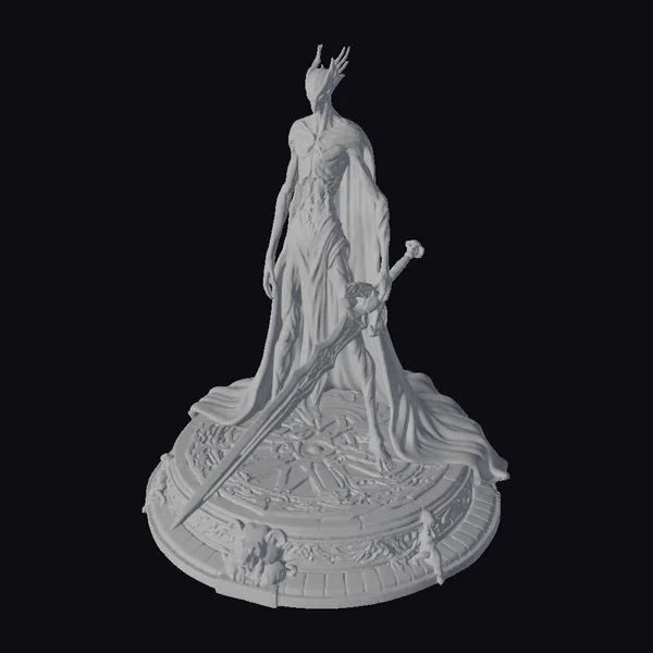 Detailed with precision, this stylized model showcases an abstract gothic alien figure posed dynamically on a circular base adorned with ancient symbols and skulls. The figure’s elongated body, draped in flowing dark attire, holds a substantial Celtic-style sword with gold accents. Its head, resembling a crown or antlers, adds a fantastical element. The model’s dark color palette and detailed textures evoke a sense of mystery and power. Ideal for use in games, 3D printing, VR/AR experiences, animation, and design projects, this model brings a unique, dark fantasy element to any creative endeavor.