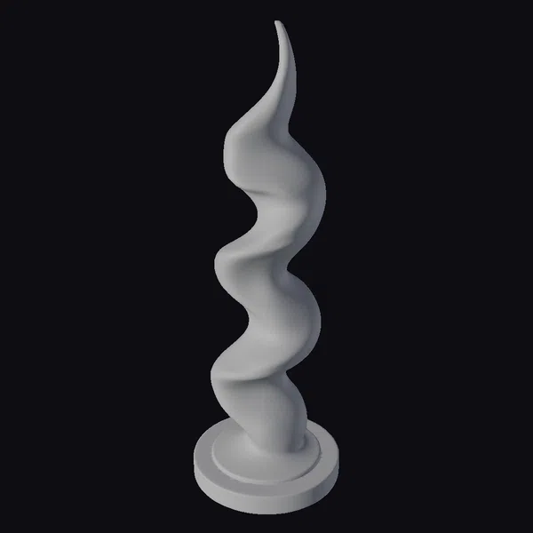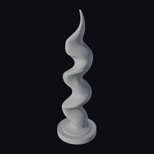 Perched dynamically on a dark oak wood base, this abstract metal spire sculpture commands attention with its fluid, curved design. The silver surface exhibits a subtle shine, accentuating the smooth transitions between its wavy, organic forms. Crafted with precision, the sculpture’s abstract shape seems to defy gravity, tapering to a point at its apex. Ideal for enhancing 3D environments, animations, or architectural visualizations, this model brings a touch of modern sophistication to any scene. Its detailed texture and reflective surface make it perfect for close-up shots or as a decorative accent in games, VR/AR experiences, or design projects.