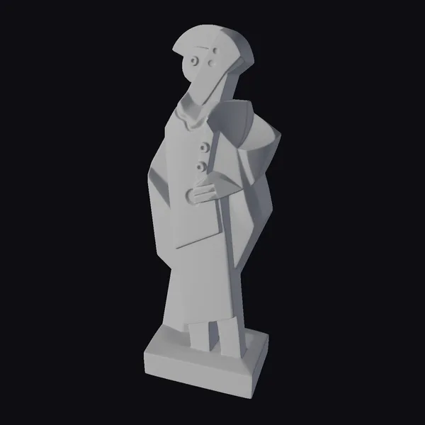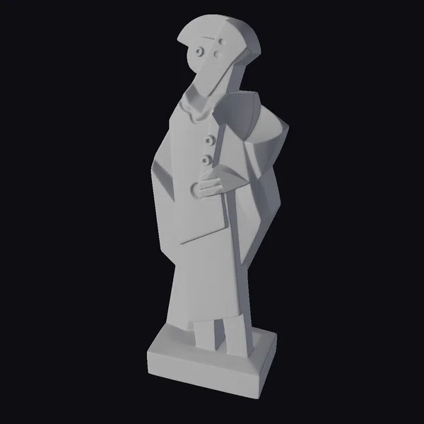 Positioned on a square base, the abstract musician’s pose is characterized by a gentle lean to the right, their left hand resting on their chest. The cubist-inspired design breaks down the figure into geometric shapes, emphasizing clean lines and a monochromatic cream color palette that suggests a wooden material. The musician’s ‘face’ is a simple, smooth area with two small dots for eyes and a curved line for the mouth, adding to the abstract nature of the piece. This 3D model would be perfect for projects requiring a unique artistic element, such as animations, games, or architectural visualizations. Its abstract nature allows for versatile application in various creative fields, from graphic design to virtual reality experiences.