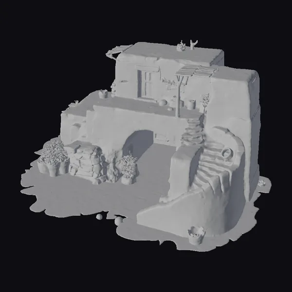 Nestled into the side of a desert hill, this stylized adobe house features a sturdy wooden door at its center, flanked by potted plants and a stone staircase leading to a second level. The walls, rendered in warm tan hues, exhibit a textured, earthy quality, while a small archway invites exploration beneath the structure. The roof, adorned with additional greenery, blends seamlessly into the desert landscape. Ideal for use in games, animations, or architectural designs, this model brings a touch of rustic charm to any project.
