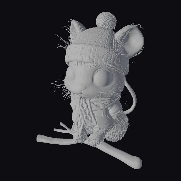 This charming, stylized mouse model is dressed in a delightful winter ensemble, featuring a soft, orange scarf wrapped snugly around its neck and a cream-colored hat with a colorful, snowflake-like pattern and a playful pom-pom on top. The mouse’s fur is a warm, golden brown, with a white face and a tiny pink nose. Its large, black eyes are full of wonder as it sits on a sturdy branch, its tail curled around behind it. The model’s intricate details, from the texture of its fur to the knit pattern on its hat, make it perfect for use in various creative projects, such as animation, games, or 3D printing. Its small size and adorable expression make it an ideal character for adding a touch of whimsy to any scene.