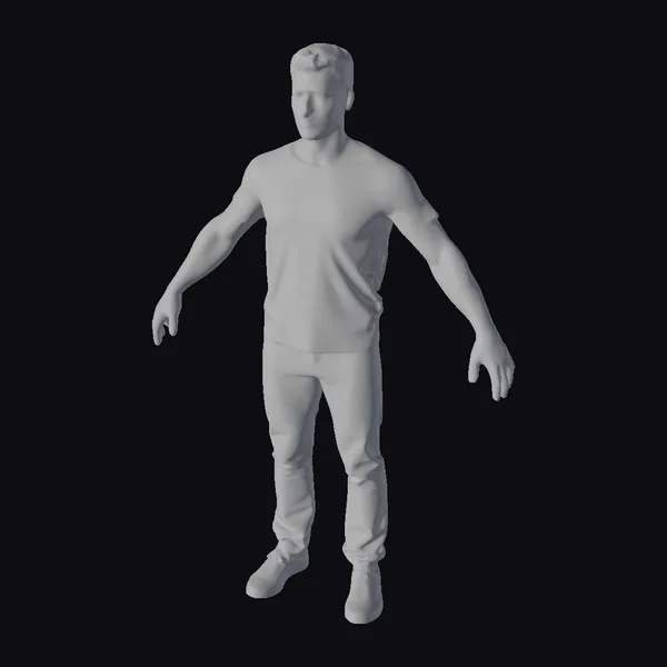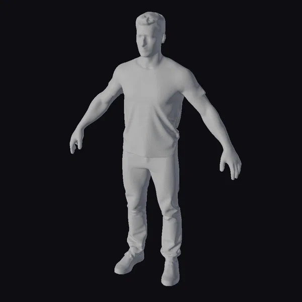Detailed with precision, this 3D model showcases a 30-year-old man in a precise T-pose, with arms extended horizontally and palms facing forward. His short, dark hair and subtle facial features contribute to a realistic and neutral appearance. The model is dressed in a fitted white T-shirt and gray pants, with a focus on clean lines and minimal wrinkles, making him an ideal character for various applications. The bare feet add to the model’s versatility, allowing for easy adaptation to different environments and scenarios. Suitable for use in games, 3D printing, VR/AR experiences, animation, and design projects, this model provides a solid foundation for creators.