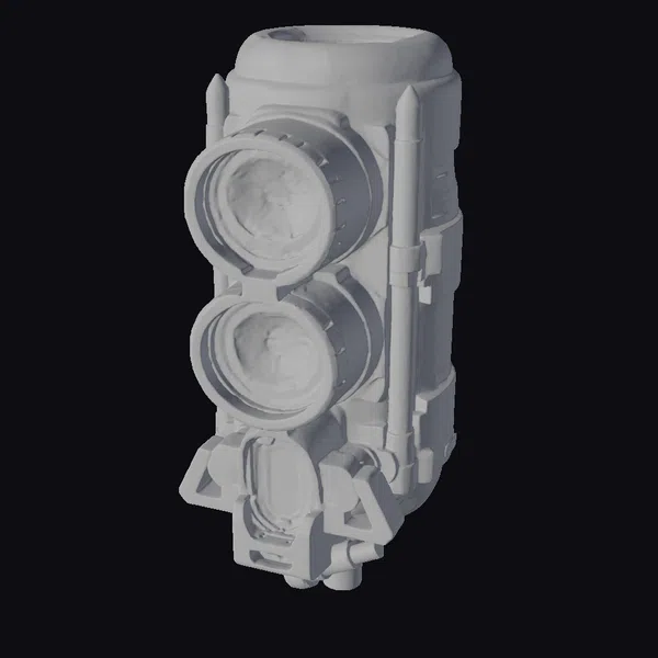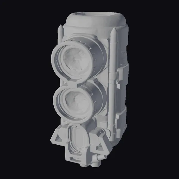 Positioned at a dynamic angle, the rebreather device showcases its complex design, with two prominent cylindrical lenses stacked vertically on its front. The lenses, encased in rugged black frames, are accentuated by a thin white line that adds a touch of contrast. A small, oval-shaped component is nestled below the lenses, set against a bright blue base that adds a pop of color to the otherwise monochromatic device. The body of the rebreather is adorned with various attachments and details, hinting at its advanced functionality. Ideal for use in games, 3D printing, VR/AR experiences, animation projects, or design visualizations, this model brings a touch of sci-fi authenticity to any creative endeavor.