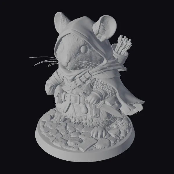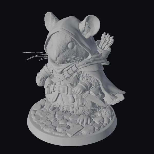 In a dynamic pose that exudes confidence and readiness, this chinchilla adventurer stands proudly on a stone base, surrounded by a scattering of gold coins that glint in the light. The intricate details of its fur are beautifully rendered, with soft, fluffy textures that invite the eye to linger. The chinchilla’s large, round eyes sparkle with a sense of adventure, while its brown hooded cloak and red bandana add a pop of color to its ensemble. A leather belt cinches at its waist, from which a sword hangs at its side, and a quiver full of arrows is slung over its shoulder. The overall effect is one of whimsical charm, making this model a delightful addition to any fantasy setting. Whether you’re creating a game, animation, or simply looking for a unique decorative piece, this adventurer chinchilla is sure to captivate.