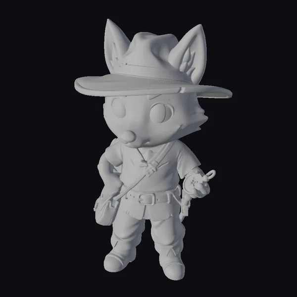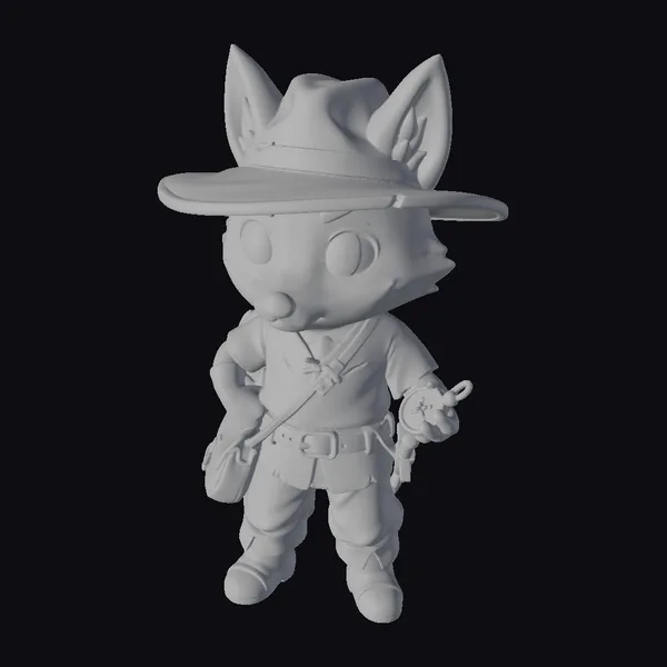 Detailed with precision, this cartoon fox stands confidently, sporting a wide-brimmed hat and a brown leather jacket, pants, and boots. Its bright orange fur and large, curious eyes sparkle with excitement. A sword is gripped firmly in its hand, while a bag hangs from its shoulder, suggesting a readiness for any quest. The model’s stylized features and vibrant colors bring a sense of fun and adventure to any project. Ideal for animations, games, or designs that require a dash of whimsy and bravery.
