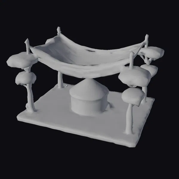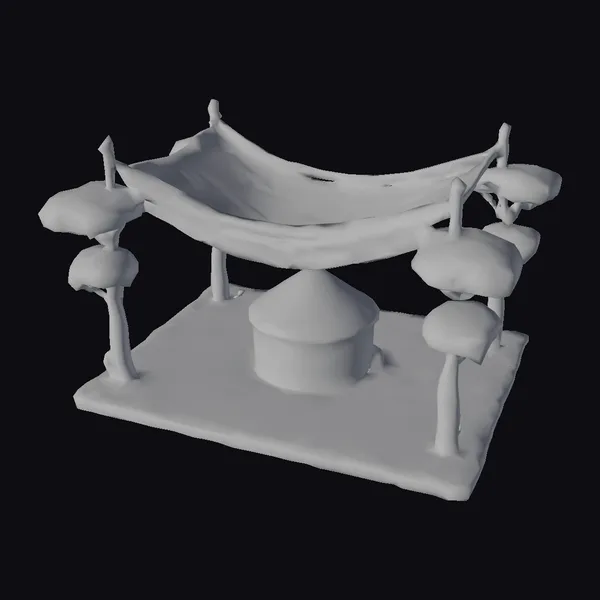In a majestic display of cultural heritage, large sheets of African cloth are stretched across a stylized acacia tree, supported by its gnarled branches. The cloth boasts an array of intricate patterns and colors, from deep blues and greens to warm yellows and reds, each panel uniquely designed. The display sits atop a matching vibrant mat, surrounded by small, stylized trees that add to the scene’s natural ambiance. This setup not only highlights the beauty of African textiles but also creates a visually captivating scene. Ideal for use in games, 3D printing, VR/AR experiences, animation, and design projects, this model brings a touch of traditional African culture to any creative endeavor.
