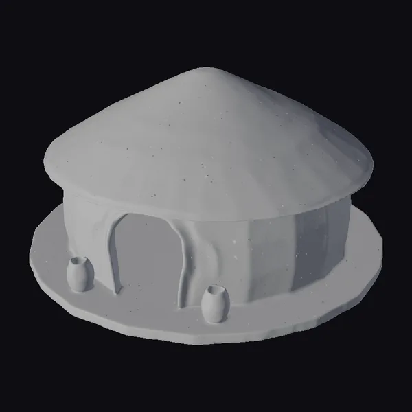 Nestled on a circular platform, the African earthen hut presents itself with a sturdy, rounded silhouette, its earthen walls glowing softly in a warm, earthy tone. The thatched roof, with its frayed edges and subtle green moss growth, adds a touch of natural elegance. Two earthen pots flank the entrance, accompanied by tufts of grass that bring a hint of life to the scene. The doorway, open and inviting, reveals a glimpse of the interior. This stylized model captures the essence of traditional African architecture, making it perfect for projects seeking an authentic, rustic feel, whether for games, animation, or design.
