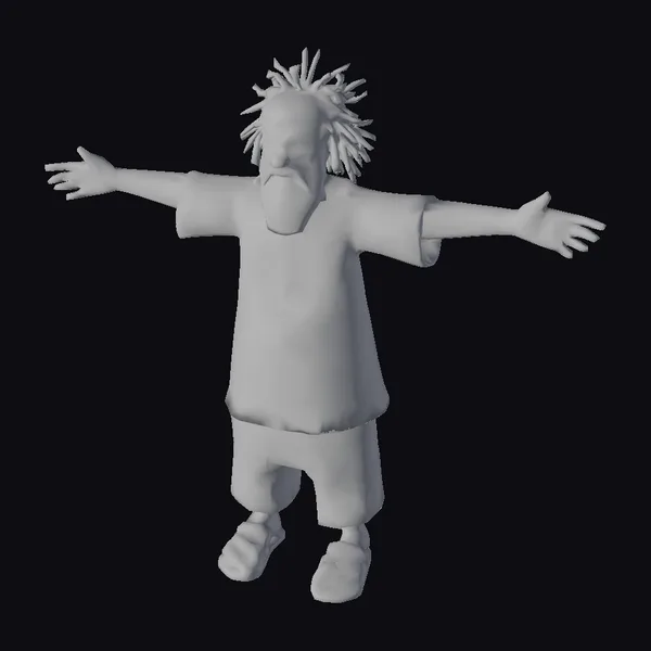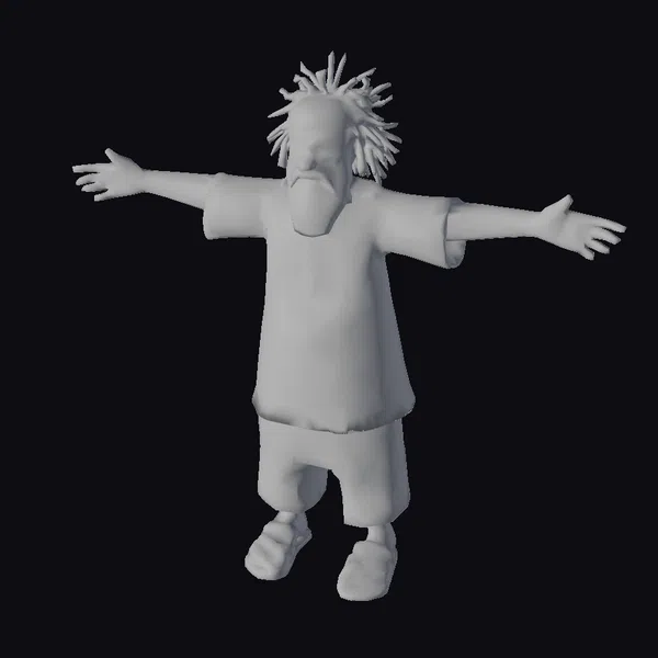 Standing tall with arms outstretched in a classic T-pose, this 3D model of an elderly African man showcases intricate details such as textured dreadlocks and a flowing white beard. His traditional attire is a feast for the eyes, with an orange tunic and shorts featuring blue, green, and yellow patterns, complemented by layered necklaces and a headband. The model is perfect for projects requiring a stylized, culturally rich character, such as animations, games, or virtual environments. The stylized approach gives the model a unique, almost cartoonish feel, making it versatile for various creative applications.