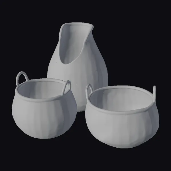 In a stunning display of traditional craftsmanship, these African hanging baskets boast intricate patterns and earthy tones. The two smaller baskets, adorned with black and white geometric patterns, sit alongside a larger, uniquely shaped vessel featuring a colorful mosaic design. Made from natural fibers, these baskets exude a sense of authenticity and cultural heritage. Their vibrant colors and textures make them perfect for adding a touch of global charm to games, 3D environments, or animations. Whether used as decorative elements or props, these baskets bring a sense of warmth and coziness to any setting.
