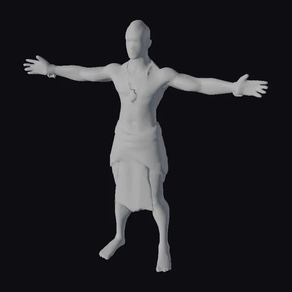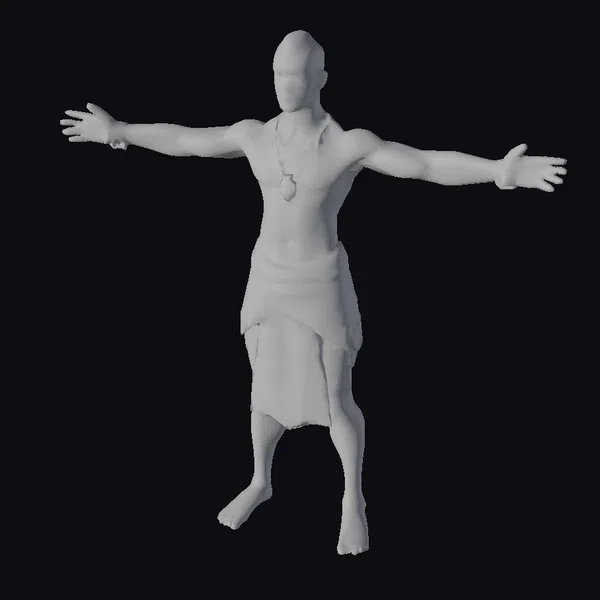 This 3D model captures a powerful African male warrior in a neutral T-pose, showcasing his impressive physique. His dark skin is complemented by a traditional loincloth wrapped around his waist, secured with a leather belt and crossed straps. A striking necklace and bracelets add to his ethnic attire. The model’s facial features are detailed, with a focused expression. He stands barefoot, emphasizing his connection to his cultural roots. This model is perfect for projects requiring a realistic and culturally inspired character, such as animations, games, or historical reenactments.