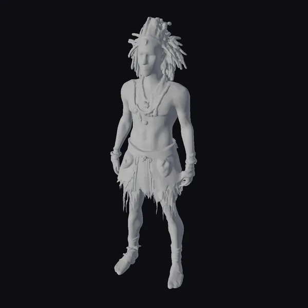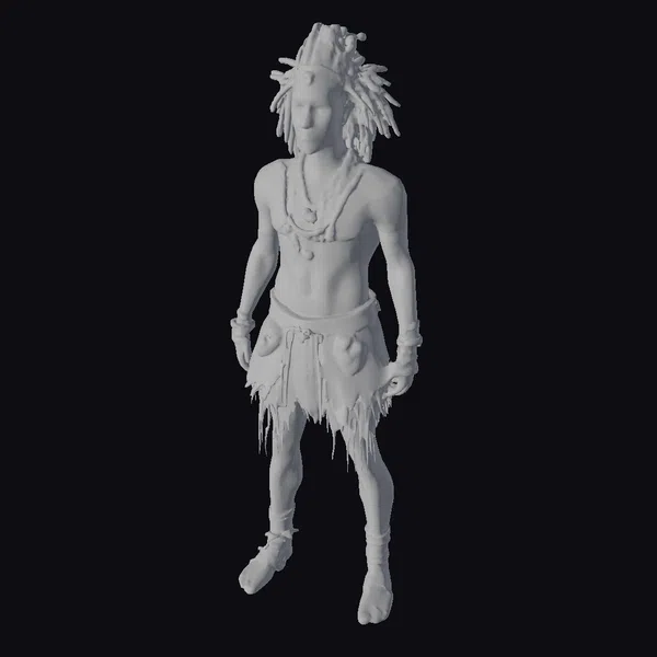 Standing tall with a commanding presence, this African tribal warrior showcases a blend of raw power and cultural richness. His muscular build is emphasized by the traditional loincloth crafted from animal skin, which contrasts with the sleek, tanned skin. The headband, a kaleidoscope of colors, wraps around his forehead, from which sprout impressive dreadlocks that add to his wild and fierce demeanor. Adorning his neck, wrists, and ankles are layers of beads and bracelets, each telling a story of its own. The detailed textures, from the subtle tattoos to the rustic finish of his accessories, make this model a stunning addition to any project. Ideal for use in games, animations, or as a detailed character study, this model brings authenticity and drama.