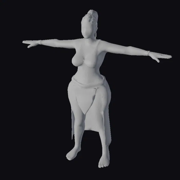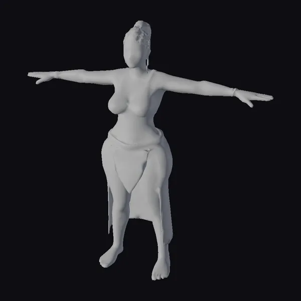 Depicted in a T-pose, this 3D model showcases a full-figure, curvaceous African woman with a rich cultural aesthetic. Her dark skin glistens with a subtle sheen, complemented by a purple headwrap that matches the vibrant cloth draped around her waist. The golden top adds a touch of luxury, while the gold jewelry – including a necklace, earrings, and bracelets – enhances her elegant appearance. With detailed textures and lifelike proportions, this model is perfect for projects requiring a realistic and culturally diverse character. Ideal for use in games, 3D printing, VR/AR experiences, animation, and design applications.