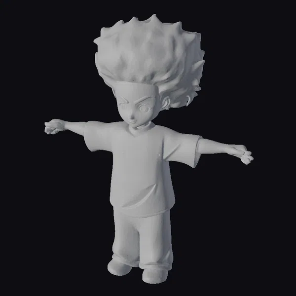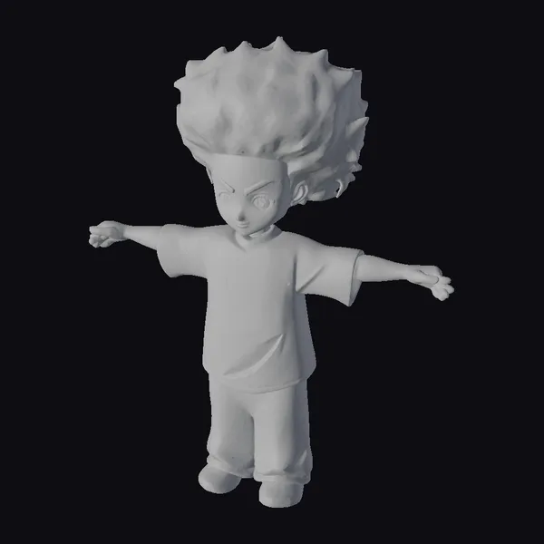 Detailed with precision, this cartoon-style anime kid model showcases a dynamic pose with arms outstretched, highlighting its 3D features. The afro-textured hair stands out against the character’s determined facial expression, complemented by a blue shirt with black accents and dark blue pants. The model’s stylized proportions and vibrant colors make it an eye-catching addition to animations, games, or any visual project. Its playful yet focused demeanor invites engagement, making it suitable for a variety of creative applications, from educational tools to entertainment media.