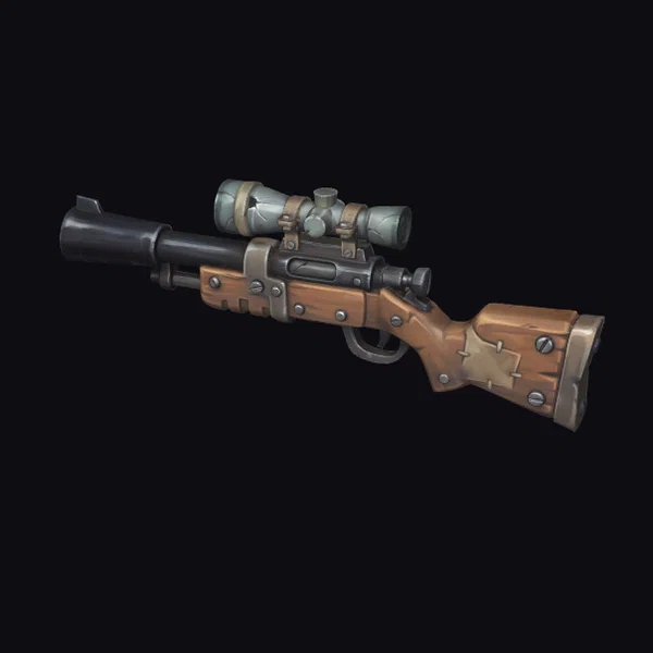 Positioned dynamically, the rifle’s body showcases a richly textured, earth-toned brown finish complemented by metallic components. The scope, secured by weathered leather straps, adds a layer of tactical sophistication. Rivets and bolts are meticulously detailed, suggesting a durable construction. This model excels in projects requiring a blend of functionality and rugged aesthetic, such as game environments, animations, or virtual reality experiences where authenticity and detail are paramount.