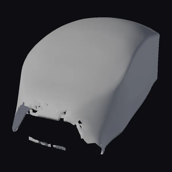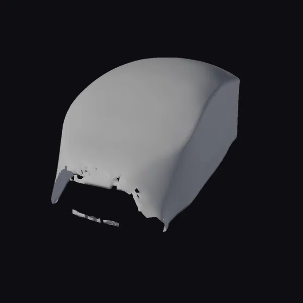 Positioned at an angle, the airbox cover presents a rugged, gray exterior, its plastic material showing signs of wear. The hole at the bottom is a stark feature, suggesting a critical point of failure or perhaps a deliberate modification. The cover’s design includes various ridges and indentations, typical of industrial components. The two small fragments placed in front hint at the cover’s previous state of completeness. This model could be a valuable asset for projects requiring detailed industrial elements, such as game environments, simulations, or architectural designs that incorporate machinery and equipment. The realistic style ensures it blends seamlessly into a variety of settings.