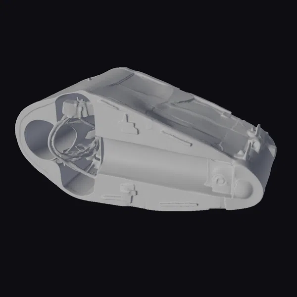 Positioned at an angle, the airsoft gun battery pack’s casing is open, exposing the intricate details within. The black plastic has a matte finish, with visible seams and mold lines. Red and black wires are neatly arranged, connecting various parts of the internal mechanism. A yellow component adds a pop of color to the otherwise monochromatic interior. The level of detail in this model makes it suitable for use in product demonstrations, technical illustrations, or as a component in larger 3D scenes. Designers and engineers can utilize this model for reference or integration into their projects, from industrial design to virtual reality applications.