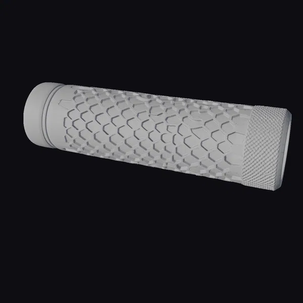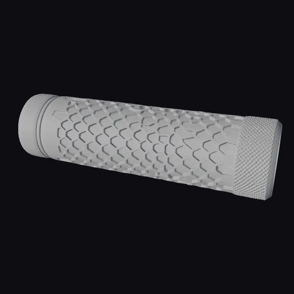 Positioned at a dynamic angle, the airsoft suppressor takes center stage with its robust, cylindrical design and distinctive honeycomb pattern etched along its length. The predominantly gray coloration, accented with darker metallic tones, lends an air of authenticity to this tactical accessory. The suppressor’s body is capped with knurled ends, enhancing grip and suggesting a utilitarian purpose. The level of detail extends to the subtle engravings and texture, suggesting a high-quality, realistic model. Ideal for use in gaming environments, 3D animations, or virtual reality experiences, this model brings a touch of realism to any project. Its detailed appearance and sturdy build make it a versatile asset for designers and creators seeking to add a layer of authenticity to their work.