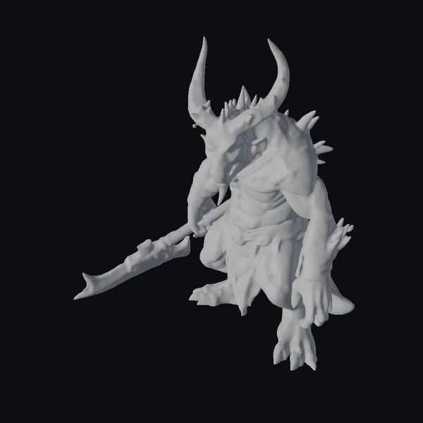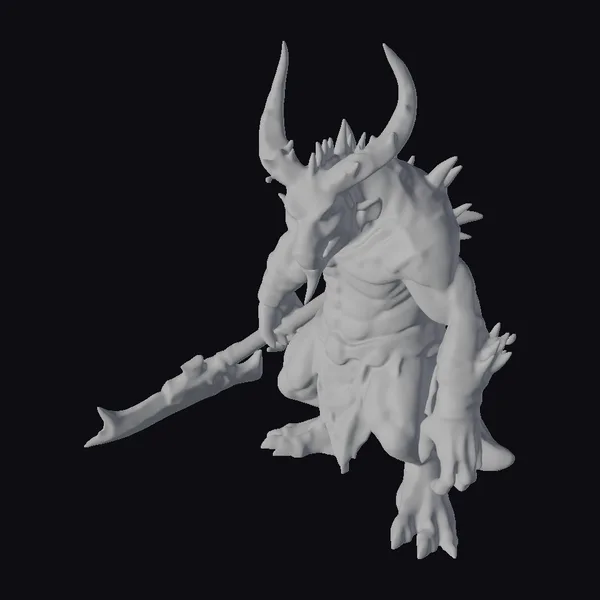 Detailed with precision, this 3D model showcases an albino orc warrior in a crouched position, exuding a sense of readiness and power. The dragon-like head, complete with long, curved horns and sharp teeth, sits atop a muscular orc body clad in detailed leather armor adorned with spikes. The warrior grips a large, sharp weapon, enhancing the overall menacing stance. The model features intricate textures, including scales on the arms and back, suggesting a hybrid creature. Ideal for use in games, 3D printing, VR/AR experiences, animation, and design projects, this model brings a unique character to any project.