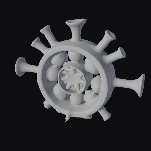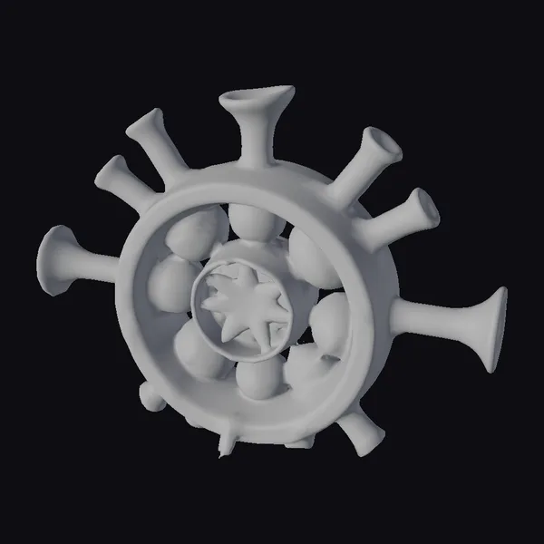 This intricate alchemical alembic presents a captivating visual feast, with its stylized, soft, and fuzzy machine parts seamlessly integrated with clay tubes, funnels, and oblong cylinders. The teal and brown hues lend an earthy, organic feel, while the embedded diatoms contribute a touch of the unknown. The apparatus is posed in a way that showcases its complex design, with multiple protruding elements and a central wheel-like feature that appears to be in motion. The textures are rich and detailed, with visible signs of wear and aging that add to the alembic’s mystique. This model would be perfect for use in scientific or fantasy settings, such as 3D rendering projects, animations, or even 3D printing. Its unique design and captivating appearance are sure to spark imagination and curiosity.