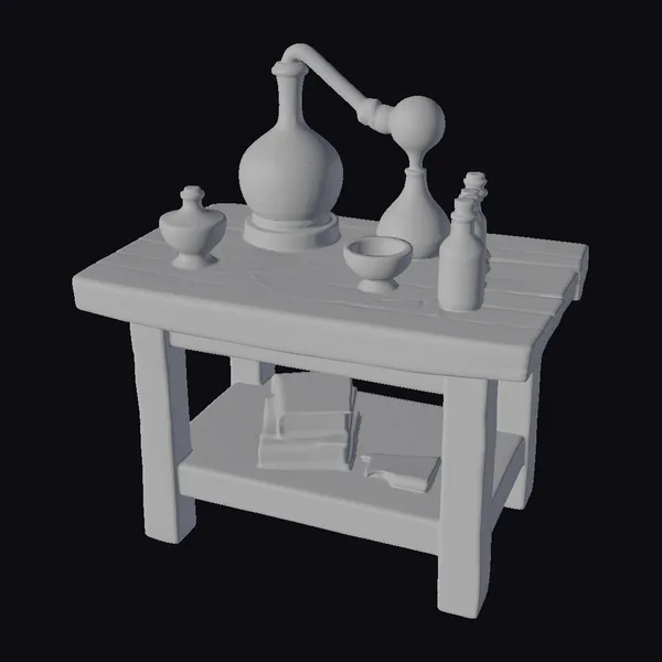 In a dimly lit corner of a mystical laboratory, a sturdy wooden workbench stands, adorned with an assortment of curious objects. A large green glass bulb, connected to a smaller one via a brass tube, sits atop the bench, accompanied by a selection of bottles and a small bowl. The workbench itself features a lower shelf, stocked with leather-bound tomes and a mysterious pouch. The entire setup exudes an air of mystique, perfect for adding a touch of ancient science to any fantasy or sci-fi environment. Ideal for use in games, 3D printing, VR/AR experiences, animation, and design projects.